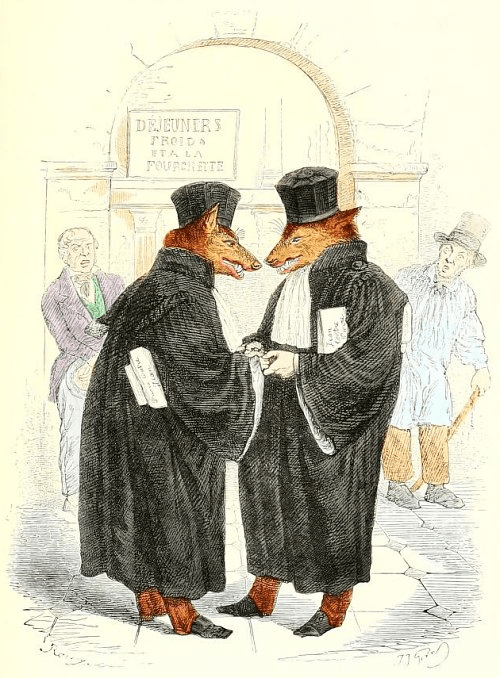 Les deux hommes-loups, si drôlatiquement dessinés par Grandville, sont deux chicanoux de la pire espèce, hurlant à qui mieux mieux dans le prétoire, l’un pour les intérêts de Jean, l’autre pour ceux de Pierre, et, hors de là, déposant leur feinte colère, se pressant les mains, rapprochant leurs museaux, devant la porte d’un restaurant où ils vont s’attabler amicalement, à la grande stupéfaction de Pierre et de Jean, dont la figure bouleversée, à l’aspect inattendu de ce qui se passe, témoigne qu’ils ont bien compris que, sans prendre part au repas, ils seront obligés de payer l’écot.
