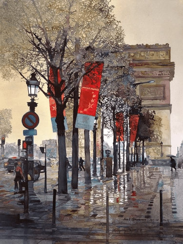 N’oubliez pas que je suis chanteur et aussitôt il me vint « un petit coin de parapluie pour un coin de paradis me vint à l’esprit (normal après le cœur). Aussitôt la rue, les passants, les chiens les trottoirs mouillés et même l’Arc de triomphe s’effacèrent. Il n’y avait plus que nous ! Mais voilà les pluies d’avril sont capricieuses ; l’averse ne fit qu’un déjeuner de soleil dès la rue traversée. il se joua de nous et reparut laissant la belle inconnue partir vers son destin. Dommage elle avait quelque chose d’un ange.