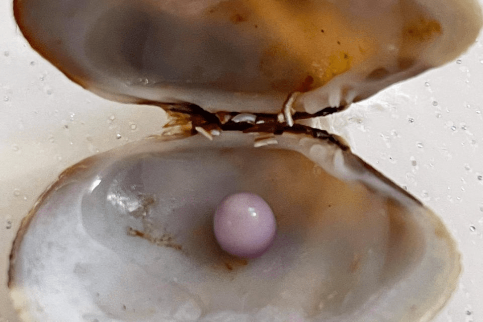 Une jolie perle dans une palourde trouvée par hasard. Pas chez moi bien sûr il faut bien que mon ami Wiki m’aide un peu de temps en temps quand ma banque de données n’est pas approvisionnée.