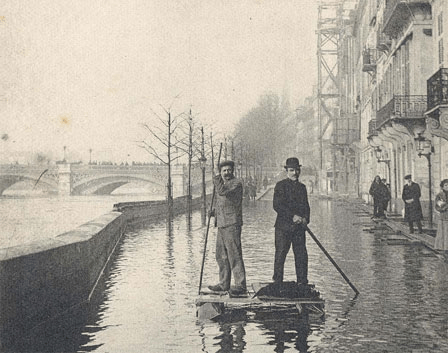Le 28 janvier 1910, une crue d’exception recouvre le centre de Paris et les bords de la Seine. Le débordement atteint un maximum de 8,62 mètres, du jamais vu dans la capitale. Les dégâts matériels sont très importants. Des milliers d’immeubles et de maisons sont inondés et 200.000 Parisiens sinistrés, mais l’on ne déplore pas de victimes à part un sapeur pompier emporté avec son embarcation.