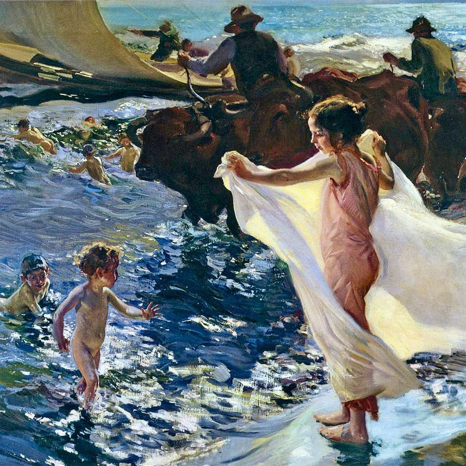 Mais oui, Sorolla et ses scènes de bord de mer écrasées de soleil, c’est un choix magnifique ! Je suis toujours amusée de voir que les garçons bronzent et se baignent tout nus, alors que les filles portent des robes, longues de surcroit…Autre temps…autres mœurs !