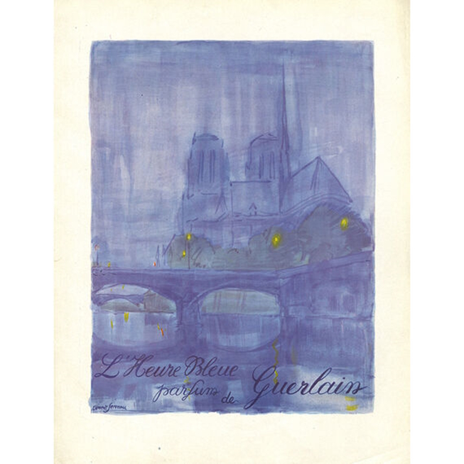 Serveau était un maître dans la création d’atmosphères et de paysages stylisés, souvent avec une touche d’élégance parisienne ou romantique. Représenter une architecture emblématique (probablement NOtre Dame) qu’il s’agisse d’une église ou d’un autre monument) surplombant un élément comme un pont dans une lumière particulière, est tout à fait dans ses cordes. C’est un moment de transition et de beauté. Une scène avec une église surplombant un pont, baignée dans les teintes bleutées du crépuscule, colle idéalement à cette poésie. Cette affiche est une pièce fascinante de l’histoire de la publicité des parfums de luxe et témoigne du talent de Marcel Serveau à créer des visuels intemporels.