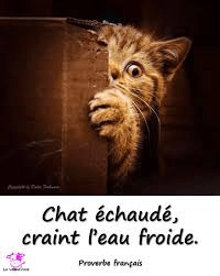 Origine : Expression française qui remonte au XIIIème siècle sous la forme « chat échaudé craint l’eau« . Le rajout de l’adjectif froide ne fait que renforcer l’idée d’une crainte exagérée. Par définition le verbe échauder désigne le fait de tremper quelqu’un dans l’eau chaude. Donc vu le traitement subi à ce chat, la vue de tout liquide lui provoquerait un traumatisme quelque soit son degré de chauffage. Cette métaphore peut se transmettre à l’homme qui par instinct va éviter de se retrouver dans pareille situation malgré le fait que sa raison pourrait lui affirmer que revivre exactement les mêmes faits n’est pas automatique comme dans le cas d’un échec amoureux.