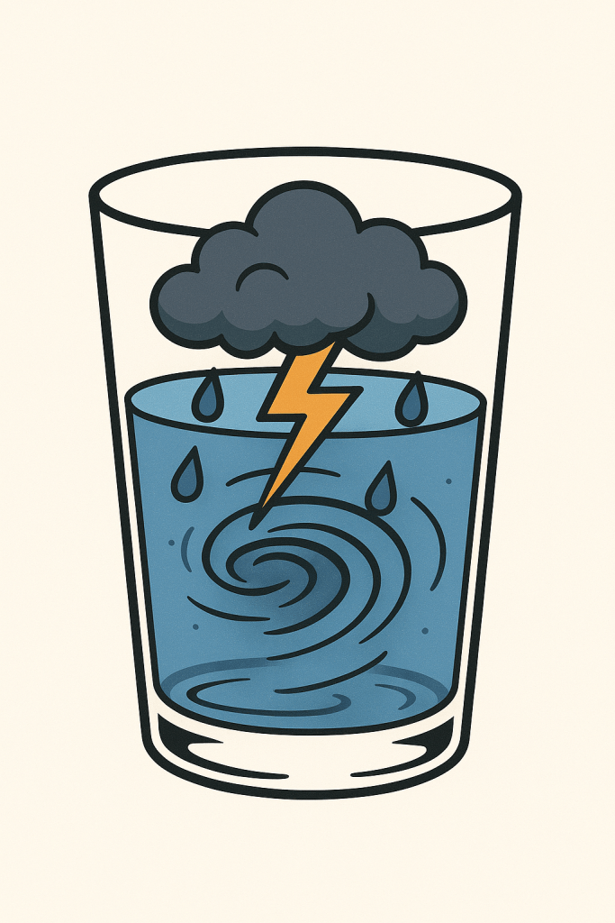 Origine : Cette expression française date de la moitié du XIX ème siècle. Elle montre une image démesurément grossie d’un événement ou d’un mouvement qui va être fortement diminué par l‘espace qui le contient. En effet, quelque soit la force de la tempête, elle ne risque pas de faire de grands dégâts dans un verre d’eau, sauf le renverser mais il n’y aurait pas de quoi semer la panique. Là même image invoquant l’infiniment grand dans l’infiniment petit, le tout proportionnellement parlant, se retrouve dans une autre expression française dont signification est à peu près équivalente à savoir « se noyer dans un verre d’eau »cette expression française se retrouve au Grand Maghreb et plus spécialement en Tunisie où il est question de cris et de témoins pour l’égorgement d’un hérisson transcrite par « ita wech’houd aala dhbihet kanfoud » et traduite plus simplement par « trop de bruit pour rien »