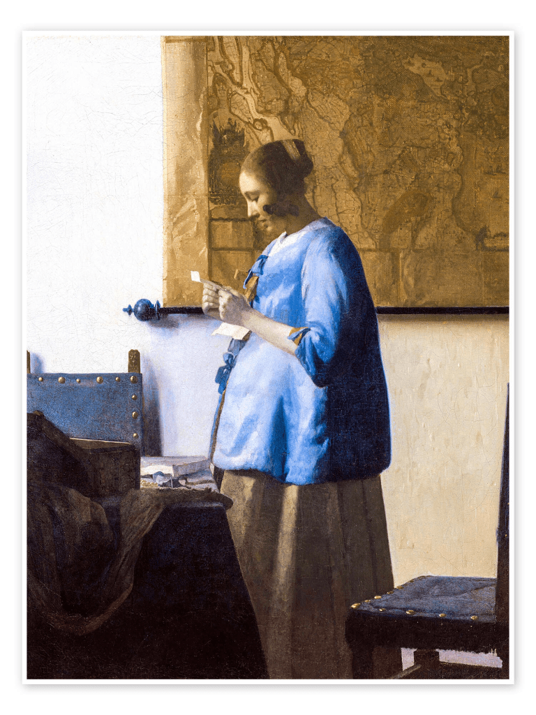 huile sur toile de dimensions modestes (environ 46,5 cm × 39 cm) représentant une jeune femme debout absorbée par la lecture d’une lettre. Elle est vêtue d’une veste d’intérieur d’un bleu intense et d’ocre, qui domine la composition. Le contenu de la lettre est inconnu, ce qui est typique des scènes de genre de Vermeer, laissant planer un mystère et permettant au spectateur de se projeter dans l’émotion de la femme. La lettre pourrait être une lettre d’amour, mais l’artiste nous laisse dans le doute.