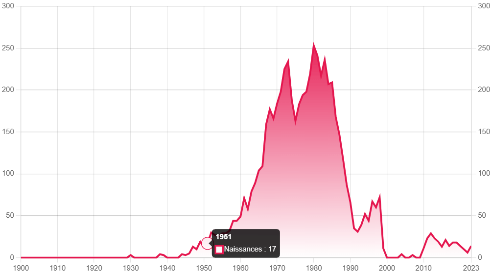 prénom qui arrive en masse en 1970 et qui retombe dans les oubliettes en 2000. Bonne fête à mon neveu !
