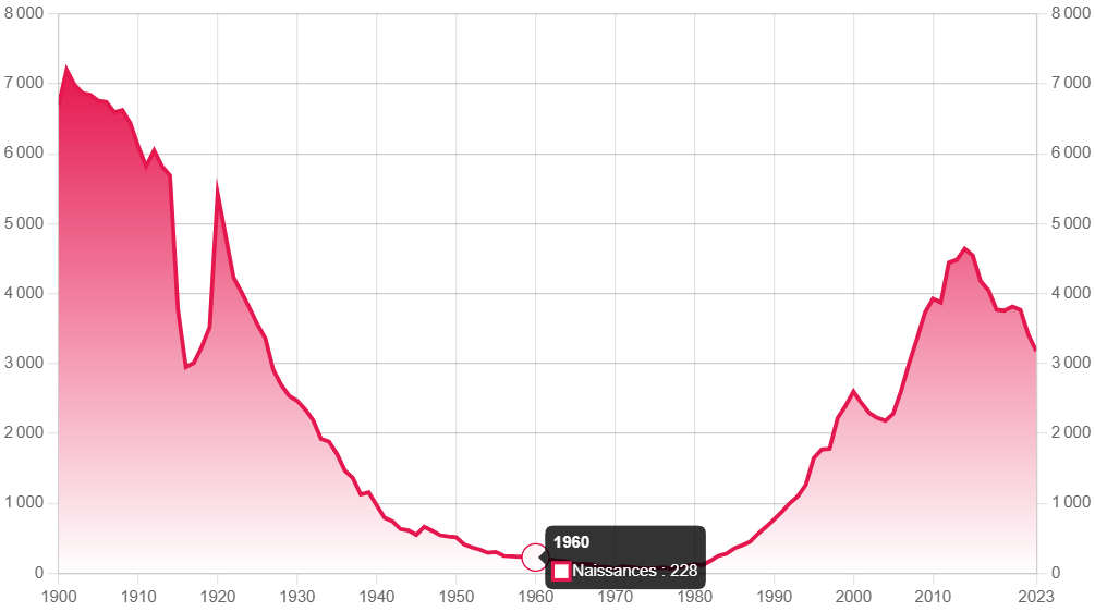 en dent de scie entre 1900 et 1960 puis se perd depuis.